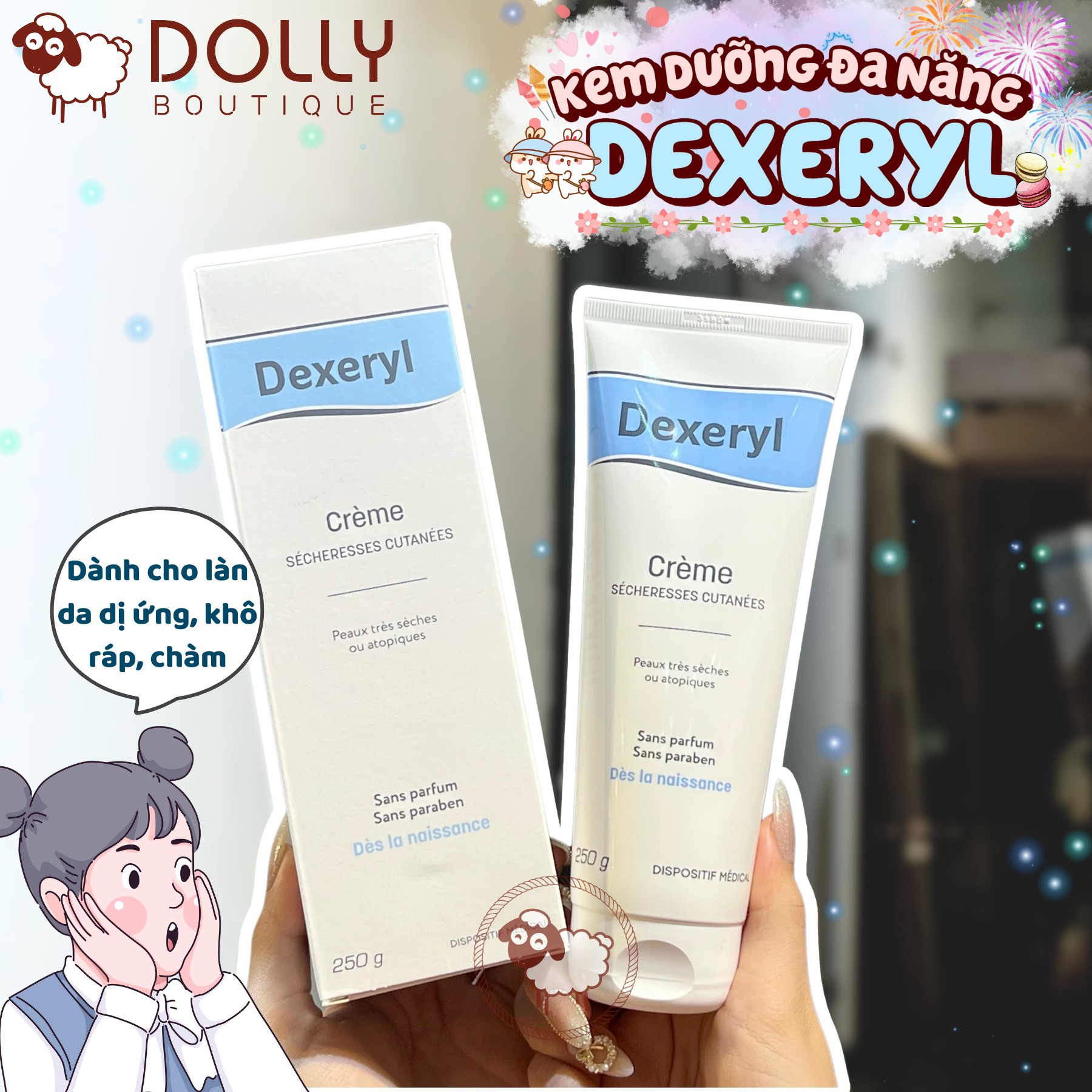 - Dexeryl là kem bôi ngoài da, mang đến những công dụng cấp ẩm, giữ nước, ngăn ngừa hiện tượng da khô, nứt nẻ, bong tróc.