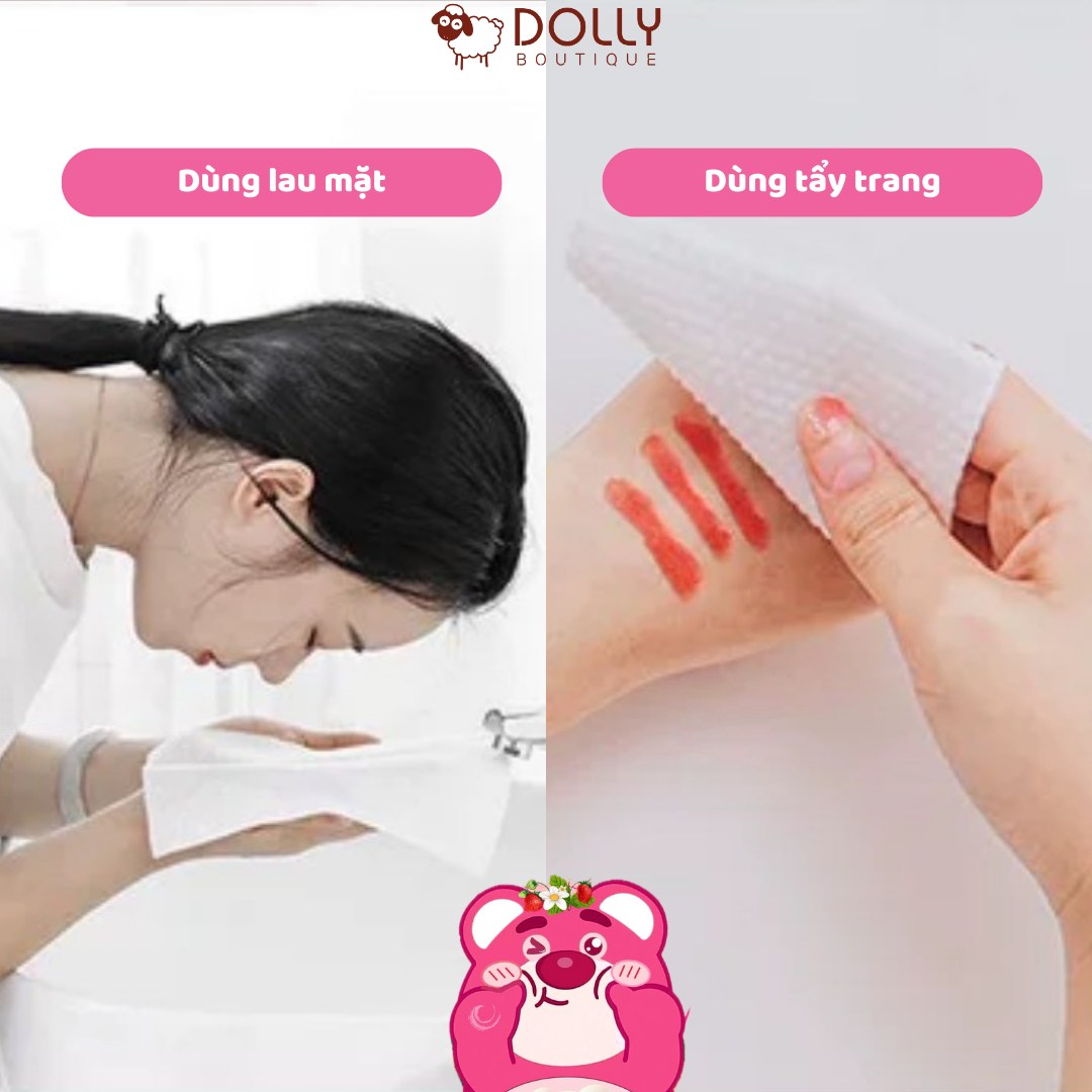 - Thiết kế: Bao bì cao cấp có in hình gấu dâu cute xĩu, lõi giấy được rút ra rất dễ dàng và tiện lợi khi sử dụng. Dùng 1 lần, đảm bảo vệ sinh và lý tưởng cho mọi làn da (kể cả dạ nhạy cảm).