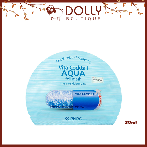 - Mặt Nạ Giấy BNBG Vita Cocktail Aqua Foil Mask 30ml là mặt nạ dưỡng ẩm sâu chuyên sâu, phù hợp với mọi loại da, đặc biệt là da khô, da thiếu ẩm, da dễ bong tróc. Sản phẩm nổi bật với công nghệ mặt nạ thiếc và công thức Vitamin Complex giúp dưỡng chất thẩm thấu sâu, làm dịu da, phục hồi hàng rào bảo vệ da và mang lại cảm giác ẩm mượt.