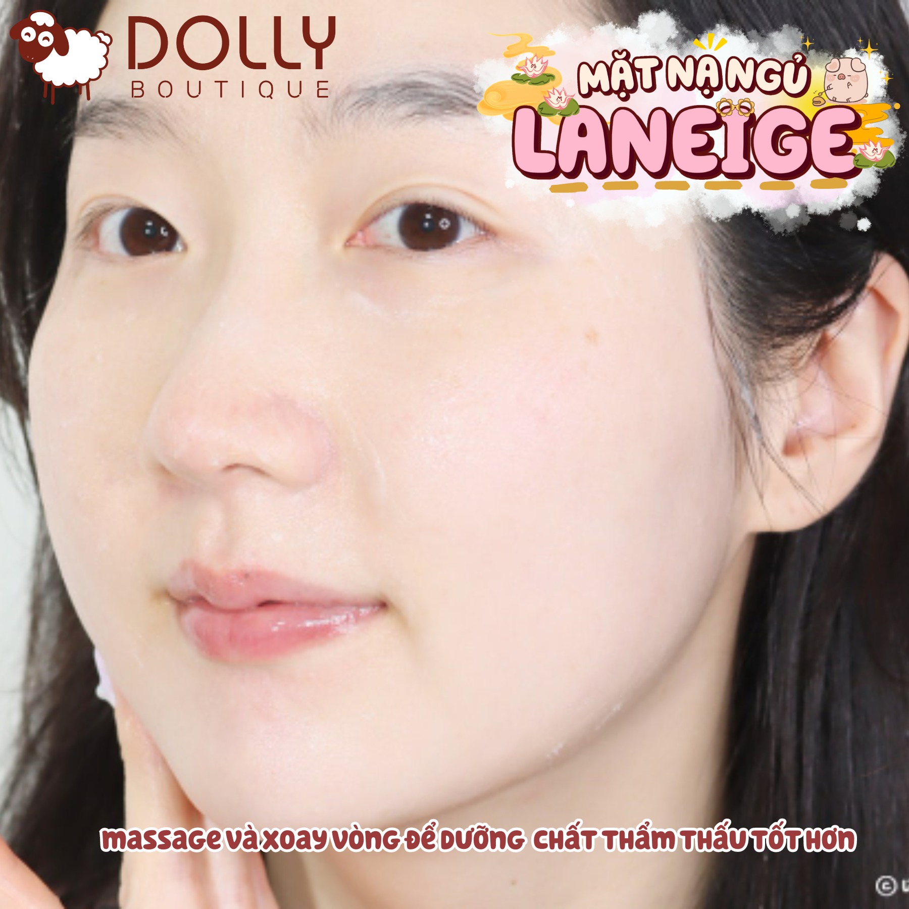 + Lấy một lượng mặt nạ ngủ vừa đủ thoa đều lên da mặt, tránh vùng mắt và môi.