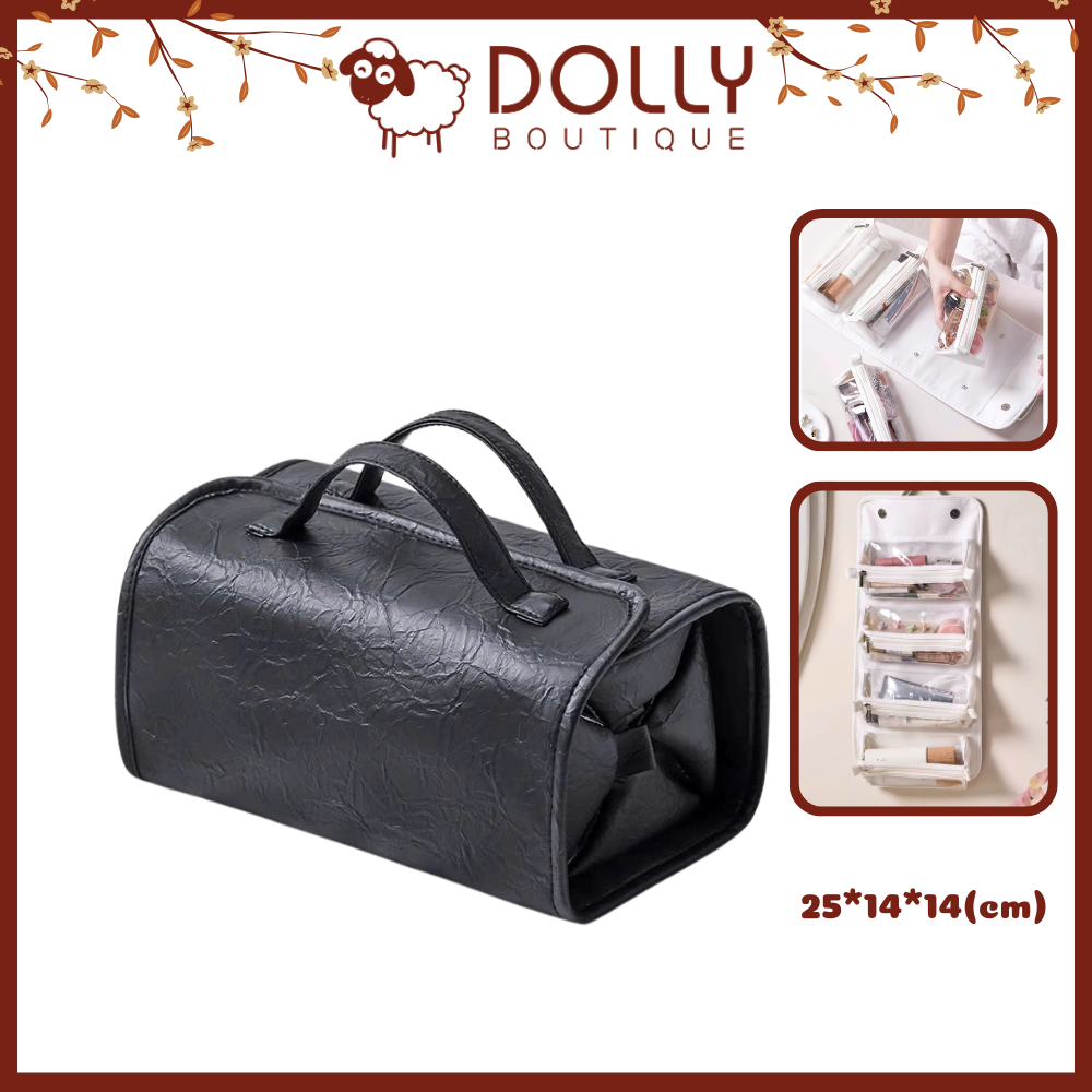 - Thiết kế như một chiếc tay nải dạng cuộn vậy đó, được bọc trong lớp da pu dày dặn là 4 chiếc túi nhỏ trong suốt có thể tháo rời, mỗi túi các nàng có thể phân chia từng loại đồ make khác nhau, lấy ra lấy vô tiện lắm luôn. Nếu hôm nào chỉ cần đem ít mỹ phẩm thì chỉ cần bỏ bớt túi nhỏ ra là lại càng nhẹ nhàng hơn rồi.